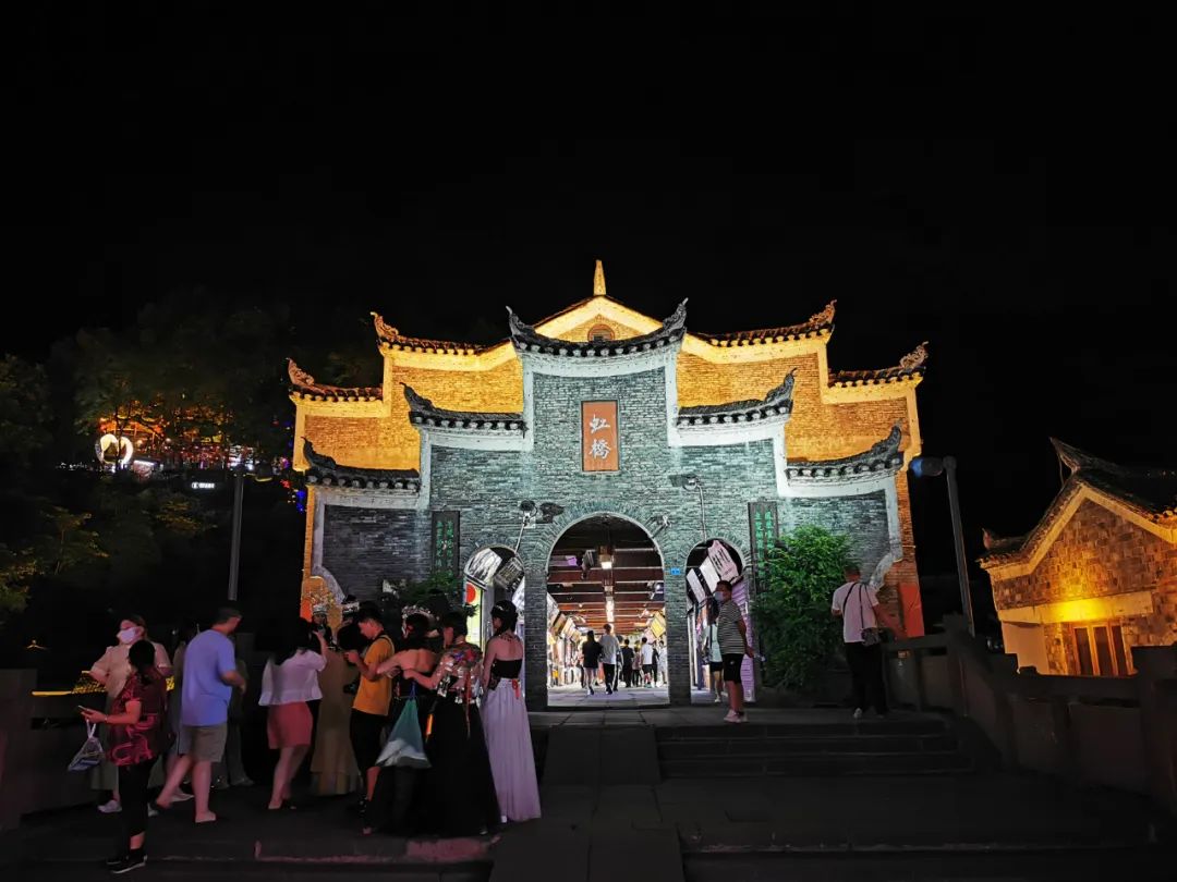 建于清代的虹桥,是凤凰九景之一,一座非常美的石拱桥桥上的吊脚楼,船轻轻划过,任何人都会被这半圆型的拱门吸引,夜晚和水中的倒影巧妙的组成了弯月,明亮夺目!从虹桥上看出去的景色也很美,随灯光变换的枝丫装点碧绿的沱江,倒影被风吹皱,清新淡雅。